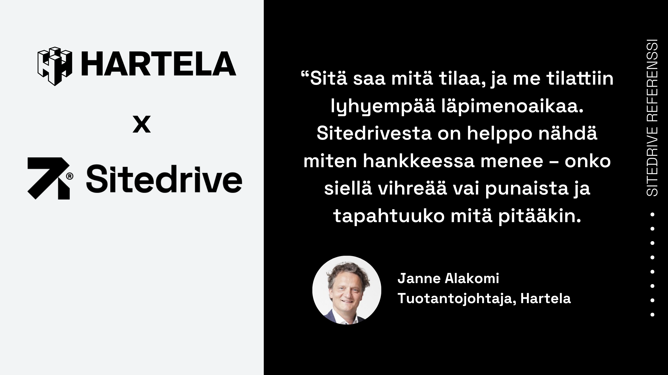 ”Mahdollisuus seurata toteumaa reaaliaikaisesti tahdin aikana vakuutti meidät Sitedrivesta. Se tarjoaa meille mahdollisuuksia joita aiemmin käyttämämme aikatauluohjelma ei. Ei riitä, että kohde valmistuu suunnitellusti – aikataulua täytyy valvoa ja ohjata jatkuvasti toteuman mukaan ja varmistaa että suunnitelmassa pysytään. Silloin ylimääräinen höntyily jää pois.”
